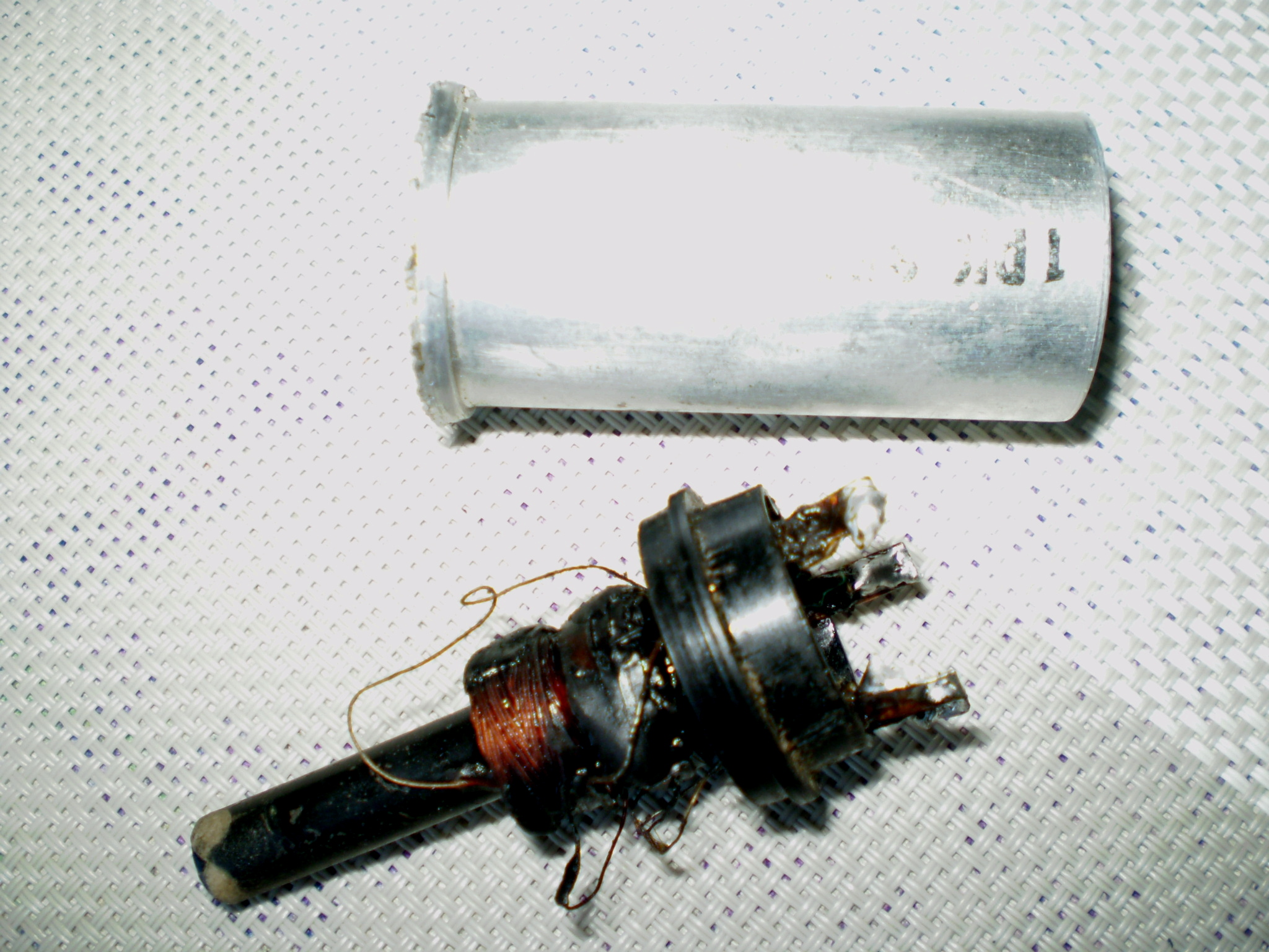 Obě cívky sjely dolů (asi teplem). Kostřička je solidní bakelit, tepelně i chemicky dostatečně stálý. Co si tyhle mefky pamatuji, cívky mají být zhruba na prst od sebe. Jasně sjely dolů k sobě. Pokud to v továrně špatně zajistili, tak ty křížově vinuté cívky budou zafixovány pouze impregnačním voskem, po zahřátí někam nad 50°C budou volně posuvné. Doporučuji mezi ně dát rozpěrku, třeba na bakelitovou kostřičku mezi ně pár závitů papírové lepicí pásky, aby ty cívky v budoucnu zas k sobě nesjely.