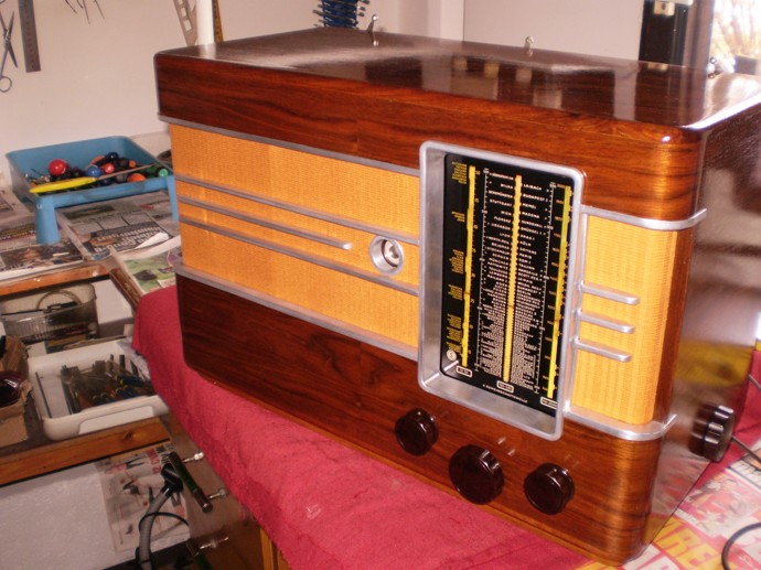 Šasi kompletně oživeno a sladěno. Rádio hraje ve srovnání s běžnými rádii Tesla z padesátých let velmi pěkně a je velmi citlivé, na 1m drátu místo antény v podvečer na SV desítky stanic, na DV , jak obvyklé , Radiožurnál a Varšava ve velmi slušné kvalitě. První problém při slaďování byl předposlední z "pertinaxů" , tentokrát 7 pF vazba antény na pásmovou propust na vstupu . Rádio již nějak hrálo, ale vše bylo citlivé na dotek a pohyb kolem vf částí . Po vyjmutí změřena kapacita cca 0,6 pF , takže signál šel dovnitř jen kapacitami montáže . Na hrazen 6,8 pF NPO. Uvnitř je navíc oproti schématu originální vazební keram. kond 2,5 pF zapojený mezi živé konce laď. obvodu , ten byl v pořádku.