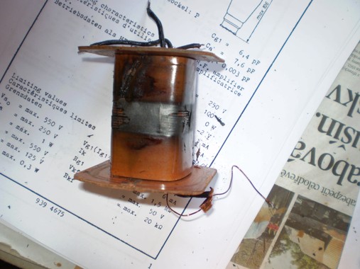 chybného spoje to kleslo na 0,2A , takže zkrat uvnitř trafa . Bohužel , žhavení je až úplně dole, na něm je primár a pak další sekundární vinutí . Zvenku vidět nic, na cívce prohořelo vinutí žhavení už i do primáru , což se blbě zjišťuje, neb to mám standartně přes odd. trafo , ale riziko úrazu el.proudem je velké . Popisuji to proto, že je zřejmě vhodné měřit důsledně izol. stav trafa před zapnutím ,pohledově to nebylo zřejmé.Jak to vypadalo na cívce po odvinutí vrchních vinutí viz obrázek ,kostra prohořela i směrem k plechům a kousek vypadl dovnitř . No už sháním drát a navíječe :) .
