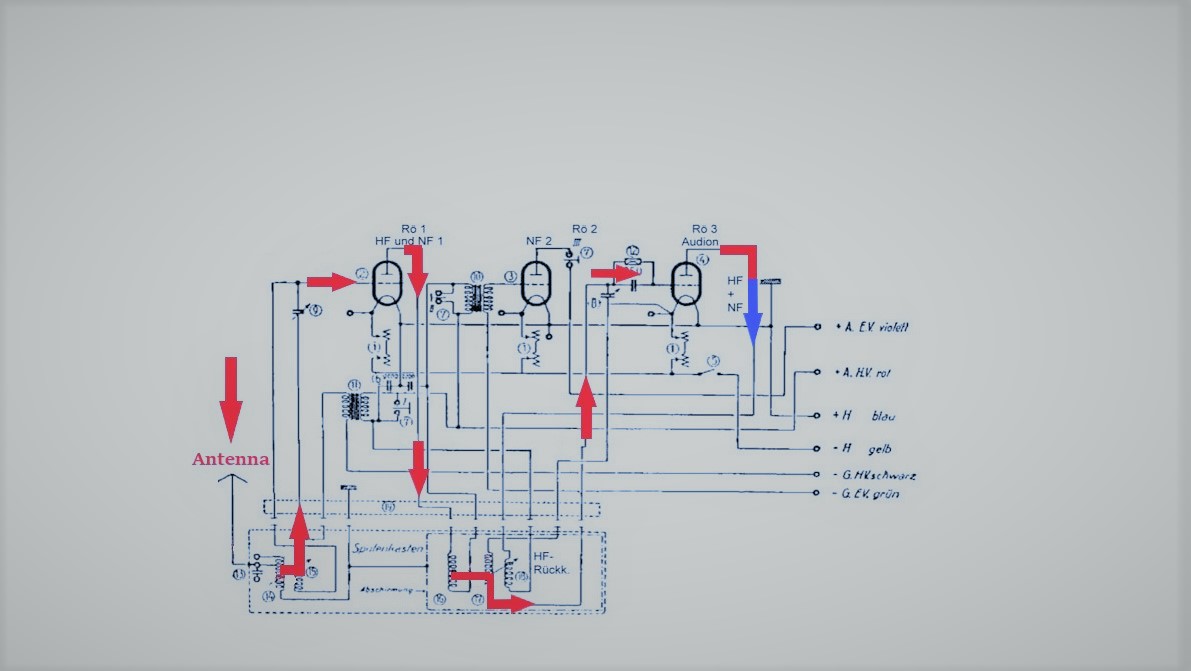 Animace vf a nf signálu při současném použití Reflexu a audionu. (1924)