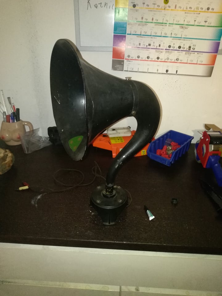 Nejde o sluchátko s trychtýřem, ale o elektromagnetický reproduktor s troubou. Z hlediska fyzikálního principu to sice vychází nastejno, ale držme se zavedené terminologie.Takové reproduktory se používaly někdy v době kamenné rádia, pro svoje nevalné vlastnosti byly brzy nahrazeny reproduktory dynamickými. A jaký je to výrobce, to bys nám snad měl říct ty, na jedné z fotek je patrný firemní štítek, z fotky ale nečitelný.