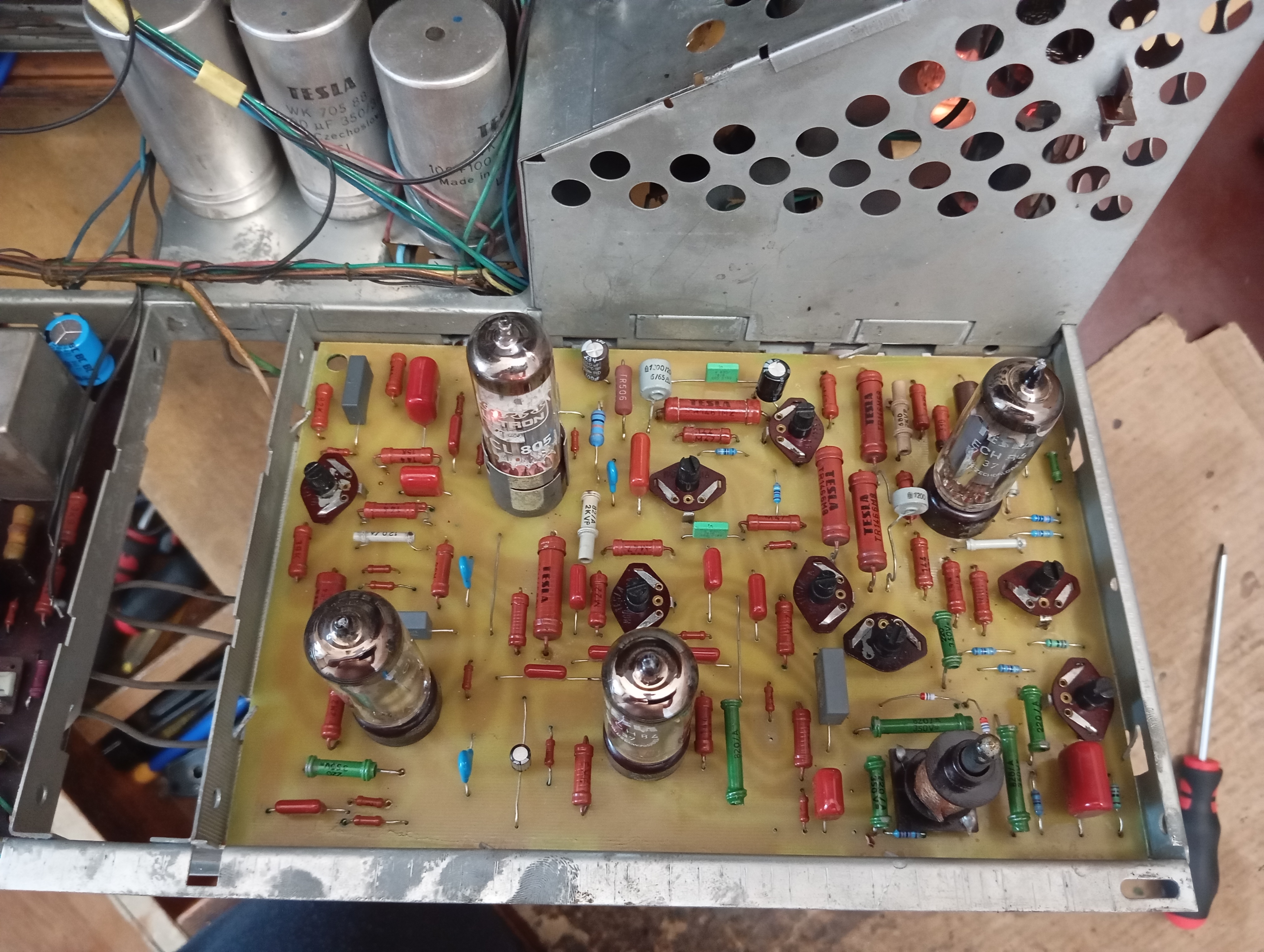 Co se týče signálové časti, tak se může u některých elektronek PCL86 (Tungsram) objevit zakmitávání nf zesilovače. Je to způsobeno tím, že v g1 pentody chybí tlumící odpor. Pokud se problém objeví, proškrábne se plošný spoj těsně u patice a ze strany spojů se připájí odpor 10k. Dále je třeba mimo klasické výměny hovňáků prověřit keramický vazební kondík na g1 C251.