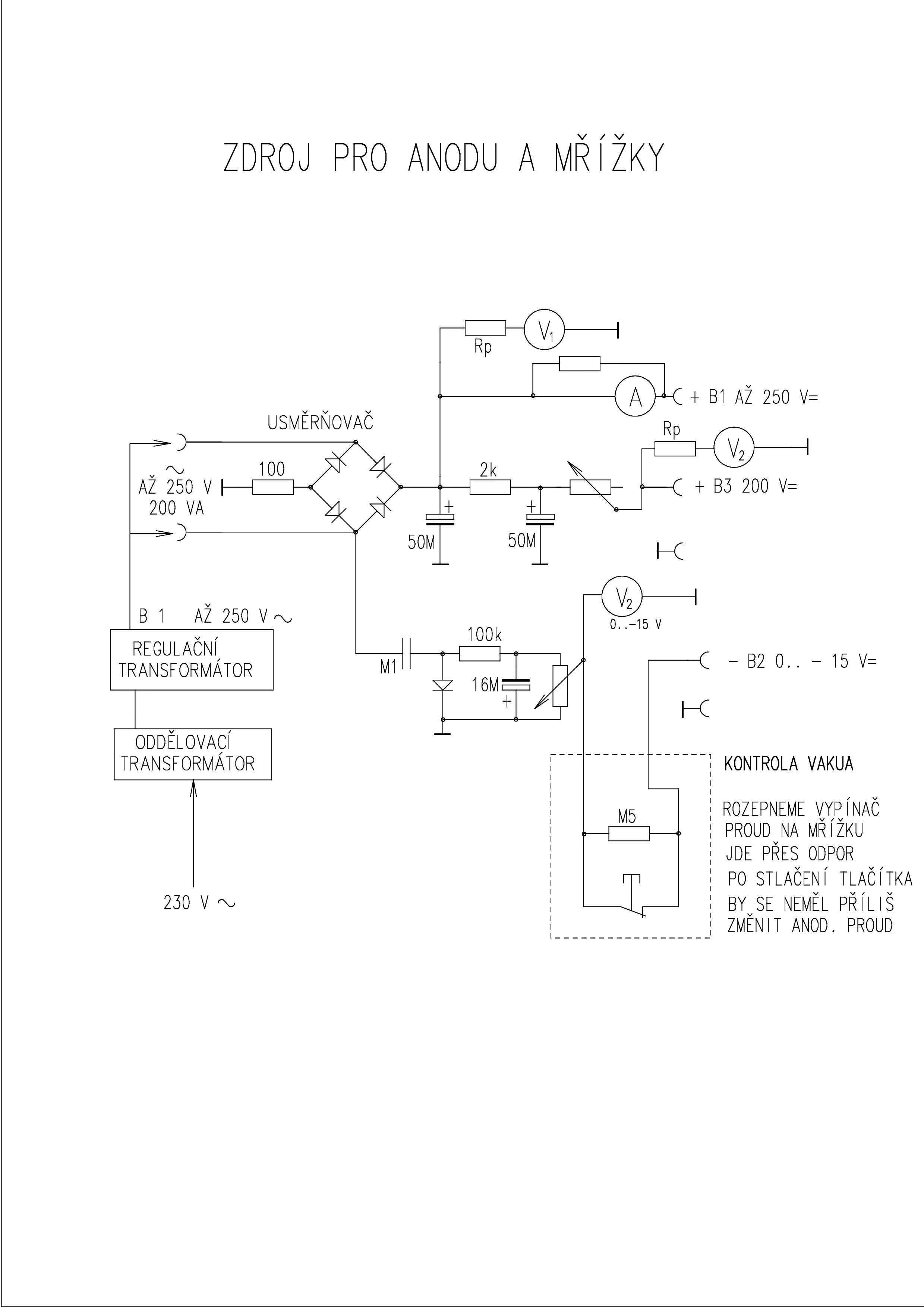 Zdroj pro anodové napětí jsem vytvořil z oddělovacího transformátoru a regulačního transformátoru. Tyto přístroje jsem si již pořídil dříve. Zapojení pro vytvoření napětí pro první a druhou mřížku je zřejmé z přiloženého schématu. Zařízení jsem vybavil voltmetrem 15 V pro záporné napětí první mřížky. Anodové napětí a napětí druhé mřížky ukazují voltmetry s rozsahem 30 V s předřadným odporem. Anodový proud ukazuje mikroampérmetr upravený na dva rozsahy 100 mA, 10 mA, přepínaný přepínačem.