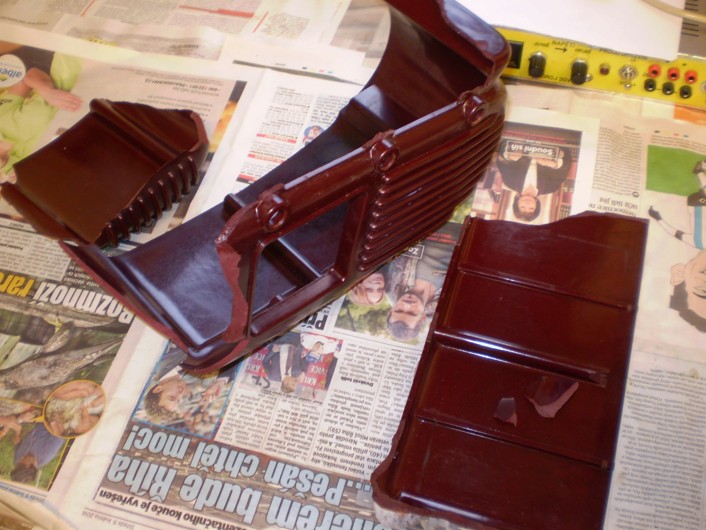 Na ukázku dávám obrázek bakelitového dílu z philipse. Celý ten lepený díl který je samozřejmě vidět mi úplně chyběl a je vyroben z tesláckého bakelitového korpusu a různě dopasovávaného. Zde jdou vidět ty problémy červeného bakelitu ale je to ve spodní části, tak to normálně není vidět.